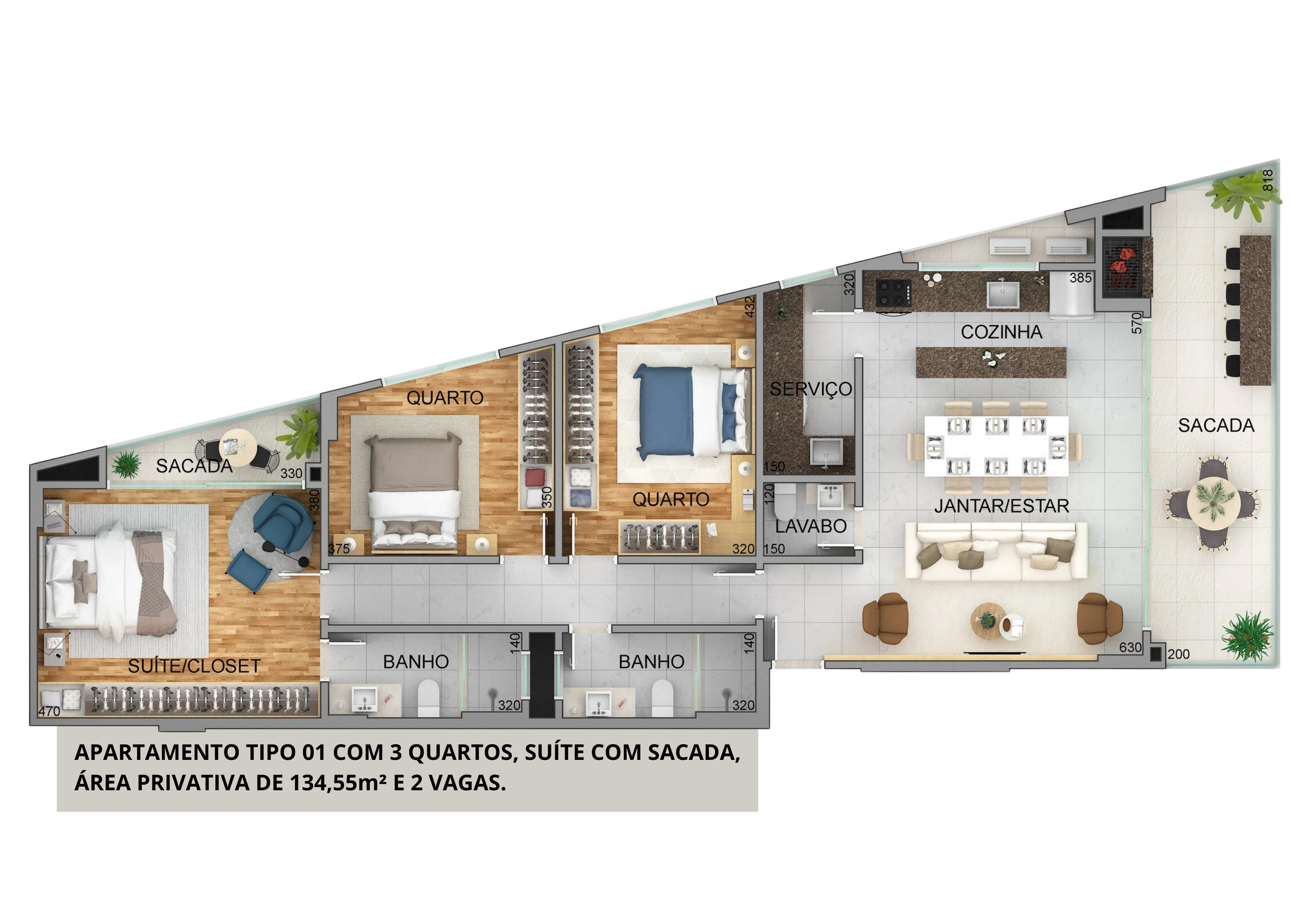SUÍTE COM SACADA DO APARTAMENTO TIPO 01.